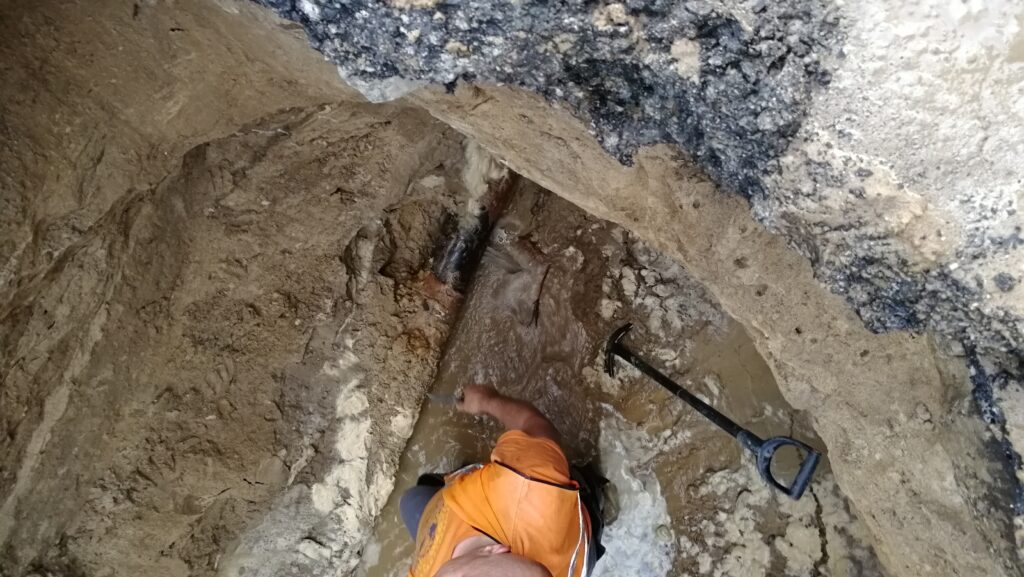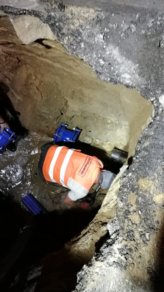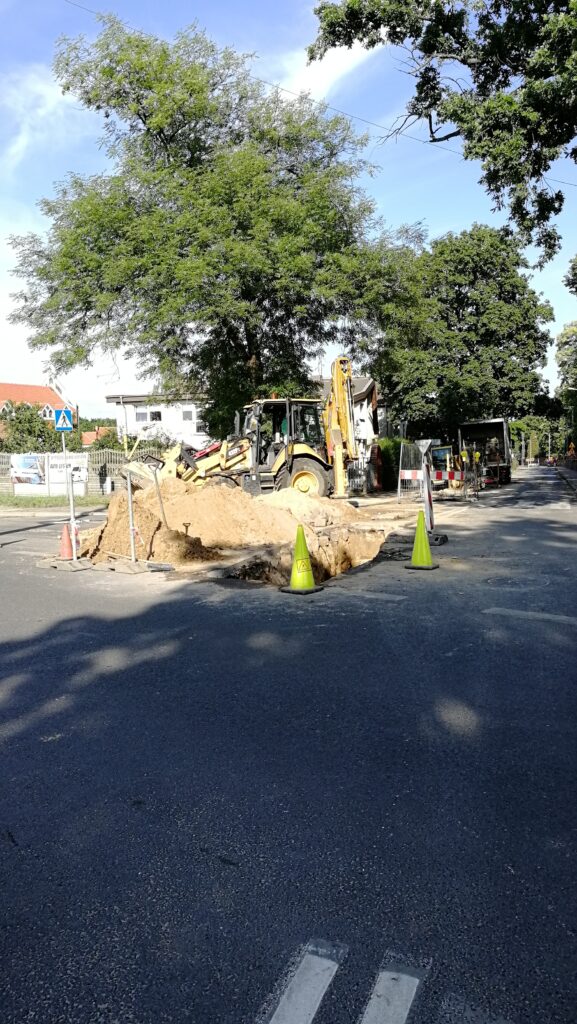 Jednak po dokonanej odkrywce okazało się, że wyciek następuje od strony ul. Kujawskiej. Tak dokonano jeszcze dwóch odkrywek i dopiero czwarta odkrywka, która miała ostatecznie miejsce na drugim pasie ul. Kujawskiej dała rezultat ustalenia miejsca przyczyny uszkodzenia niezinwentaryzowanej sieci wodociągowej. W poprzek jezdni przebiegała sieć o DN150.