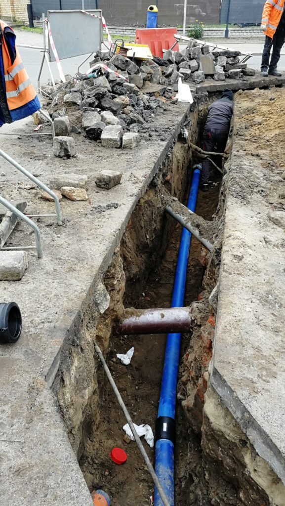 Przedsiębiorstwo Usług Miejskich Spółka z o.o. w Gubinie informuje, że na początku II dekady listopada 2023 r. przystąpiło do realizacji budowy z rur PE DN125 nowej sieci wodociągowej w miejsce już wyeksploatowanej w ul. Królewskiej w Gubinie o łącznej dł. 335,5 m. Nowa sieć wodociągowa będzie realizowana metodą bezwykopową, jak również metodą wykopową. Wszelkie wykopy pod tzw. przecisk sterowany, montaż węzłów z zasuwami oraz montaż hydrantów nastąpi wykopem otwartym. Jednocześnie zostaną zamontowane nowe hydranty nadziemne o średnicy DN80 w ilości 3 szt. wraz z wymianą 14 szt. przyłączy do granic nieruchomości o łącznej dł. 101,0 m.